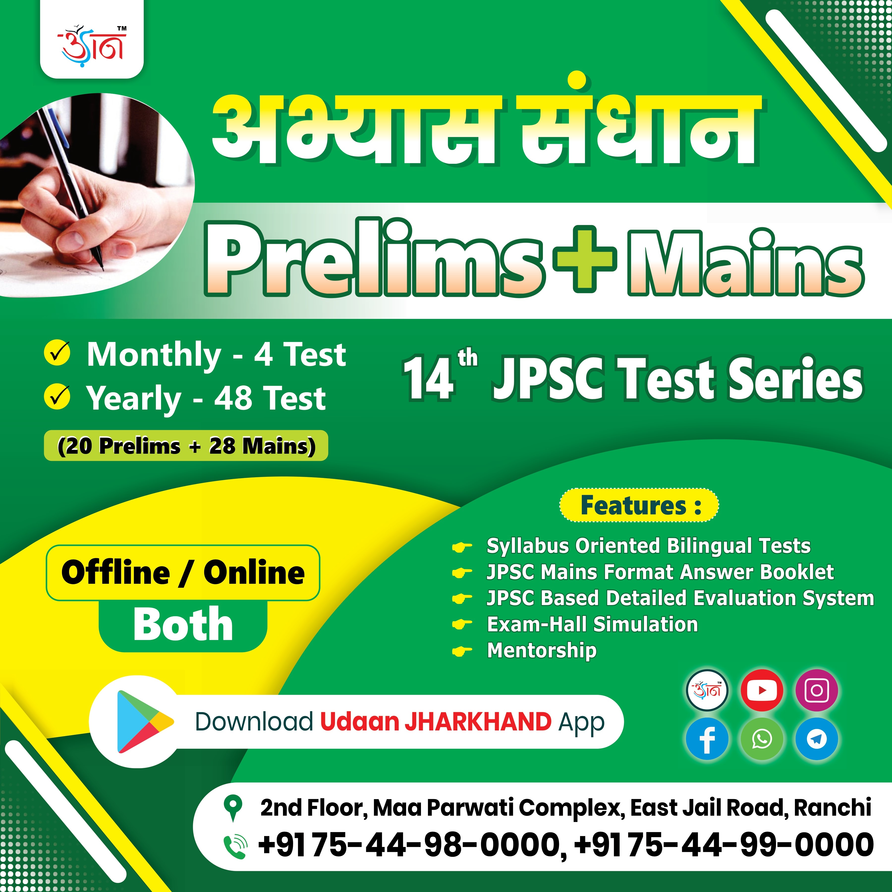 • Admissions Open -------------------------------------------- 14th JPSC PRELIMS & MAINS TEST SERIES INCLUDES: - ------------------------------------------------------------------ => 20 Prelims Test ( GS-I - 10 Test + GS-II 10 Test) => 28 Mains Test ( 7 Test of Each General Studies Paper ) => Topic wise, Sectional & Full Length Test => COMPLETELY SYLLABUS ORIENTED => BILINGUAL QUESTION PAPER (ENGLISH AND HINDI) => DETAILED SECTION WISE ANALYTICAL PERFORMANCE REPORT AND PERCENTILE RANKING => ANSWERS THROUGH LIVE & RECORDED VIDEOS => DOUBT CLEARANCE SESSION BY EXPERTS => OFFLINE AND ONLINE MODES AVAILABLE => EXAM-HALL SIMULATION FOR OFFLINE ASPIRANTS => VALIDITY PERIOD - 1 YEAR ~ If you encounter any technical problem, call our technical helpline number 9341498244. Our technical team will help you immediately.
